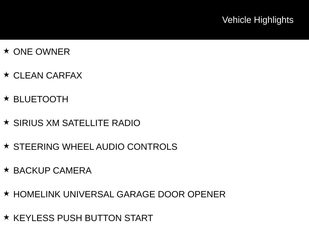ONE OWNER, CLEAN CARFAX, BLUETOOTH, SIRIUS XM SATELLITE RADIO, STEERING WHEEL AUDIO CONTROLS, BACKUP CAMERA, HOMELINK UNIVERSAL GARAGE DOOR OPENER, KEYLESS PUSH BUTTON START, POWER DRIVER SEAT, POWER PASSENGER SEAT, HEATED FRONT LEATHER SEATS, SUNROOF/MOONROOF, MEMORY PACKAGE / MEMORY SEAT, 40 PREMIUM SERIES, 17 5-ARM DESIGN WHEELS, 6 SPEAKERS, ABS BRAKES, AIR CONDITIONING, AUTOMATIC TEMPERATURE CONTROL, BRAKE ASSIST, DELAY-OFF HEADLIGHTS, DRIVER VANITY MIRROR, ELECTRONIC STABILITY CONTROL, EMERGENCY COMMUNICATION SYSTEM, FRONT DUAL ZONE A/C, HEATED DOOR MIRRORS, HEATED FRONT BUCKET SEATS, HEATED FRONT SEATS, ILLUMINATED ENTRY, LOW TIRE PRESSURE WARNING, OCCUPANT SENSING AIRBAG, OUTSIDE TEMPERATURE DISPLAY, OVERHEAD CONSOLE, PANIC ALARM, PASSENGER VANITY MIRROR, POWER DOOR MIRRORS, POWER STEERING, POWER WINDOWS, RAIN SENSING WIPERS, REAR AIR CONDITIONING, REAR FOG LIGHTS, REAR WINDOW DEFROSTER, REMOTE KEYLESS ENTRY, SPEED CONTROL, SPEED-SENSING STEERING, SPEED-SENSITIVE WIPERS, TELESCOPING STEERING WHEEL, TILT STEERING WHEEL, TRACTION CONTROL, TURN SIGNAL INDICATOR MIRRORS, VARIABLY INTERMITTENT WIPERS.