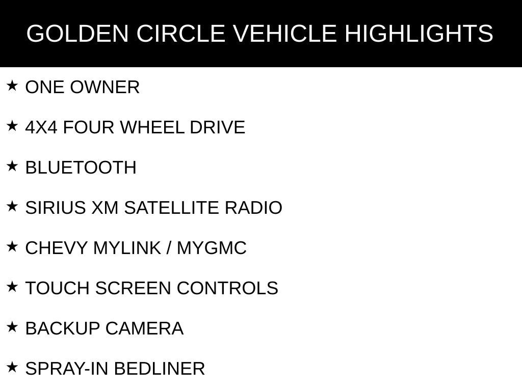 ONE OWNER, 4X4 FOUR WHEEL DRIVE, BLUETOOTH, SIRIUS XM SATELLITE RADIO, CHEVY MYLINK / MYGMC, TOUCH SCREEN CONTROLS, BACKUP CAMERA, SPRAY-IN BEDLINER, TOW PACKAGE / TRAILER PACKAGE, CUSTOM SERIES, CUSTOM CONVENIENCE PACKAGE, CUSTOM VALUE PACKAGE, PREFERRED EQUIPMENT PACKAGE 1CX, TRAILERING PACKAGE, 20 CHROME CLAD ALUMINUM WHEELS, 3.42 REAR AXLE RATIO, 6 SPEAKERS, AIR CONDITIONING, BODY COLOR REAR BUMPER W/CORNERSTEPS, BRAKE ASSIST, DEEP-TINTED GLASS, DELAY-OFF HEADLIGHTS, DUAL FRONT IMPACT AIRBAGS, DUAL FRONT SIDE IMPACT AIRBAGS, ELECTRIC REAR-WINDOW DEFOGGER, FRONT BODY-COLOR BUMPER, FRONT LICENSE PLATE KIT, HEATED DOOR MIRRORS, HEAVY-DUTY REAR LOCKING DIFFERENTIAL, LOW TIRE PRESSURE WARNING, MANUAL TILT WHEEL STEERING COLUMN, OCCUPANT SENSING AIRBAG, PASSENGER VANITY MIRROR, POWER DOOR MIRRORS, POWER WINDOWS W/DRIVER EXPRESS UP, PREMIUM AUDIO SYSTEM: CHEVROLET MYLINK, REAR STEP BUMPER, REMOTE KEYLESS ENTRY, REMOTE LOCKING TAILGATE, SPEED CONTROL, SPEED-SENSING STEERING, TILT STEERING WHEEL, VARIABLY INTERMITTENT WIPERS.