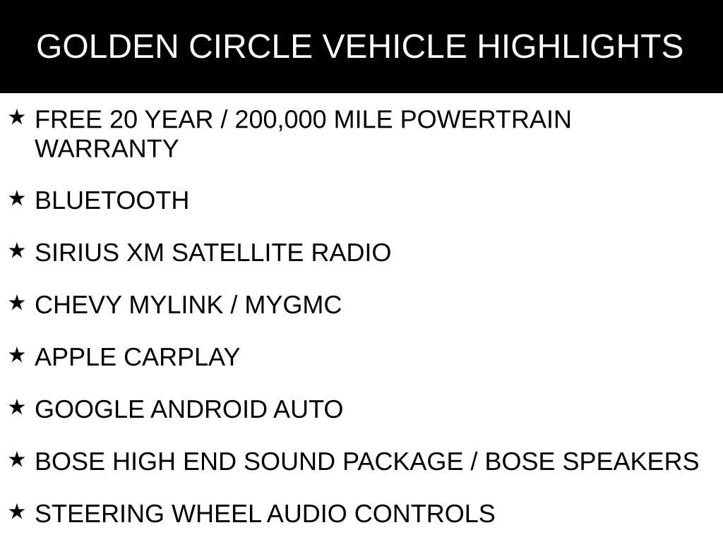 FREE 20 YEAR / 200,000 MILE POWERTRAIN WARRANTY, BLUETOOTH, SIRIUS XM SATELLITE RADIO, CHEVY MYLINK / MYGMC, APPLE CARPLAY, GOOGLE ANDROID AUTO, BOSE HIGH END SOUND PACKAGE / BOSE SPEAKERS, STEERING WHEEL AUDIO CONTROLS, TOUCH SCREEN CONTROLS, BACKUP CAMERA, HEADS-UP DISPLAY, KEYLESS PUSH BUTTON START, POWER DRIVER SEAT, POWER PASSENGER SEAT, HEATED/COOLED LEATHER SEATS, REMOTE START, HEATED STEERING WHEEL, SS SERIES, ADRENALINE RED INTERIOR PACKAGE, BATTERY PROTECTION PACKAGE, PREFERRED EQUIPMENT PACKAGE 2SS, WINTER/SUMMER FLOOR MATS PACKAGE, 20 5 SPOKE ALUMINUM WHEELS, AIR CONDITIONING, AUTO-DIMMING DOOR MIRRORS, AUTOMATIC TEMPERATURE CONTROL, BOSE PREMIUM 7-SPEAKER AUDIO SYSTEM FEATURE, BRAKE ASSIST, COMPASS, CONVERTIBLE ROOF LINING, DELAY-OFF HEADLIGHTS, DRIVER VANITY MIRROR, DUAL FRONT IMPACT AIRBAGS, DUAL FRONT SIDE IMPACT AIRBAGS, FRONT DUAL ZONE A/C, GLASS REAR WINDOW, HEATED DOOR MIRRORS, LOW TIRE PRESSURE WARNING, OCCUPANT SENSING AIRBAG, OUTSIDE TEMPERATURE DISPLAY, PADDLE-SHIFT MANUAL CONTROLS, PANIC ALARM, PASSENGER VANITY MIRROR, POWER CONVERTIBLE ROOF, POWER DOOR MIRRORS, POWER WINDOWS, PREMIUM AUDIO SYSTEM: CHEVROLET INFOTAINMENT SYSTEM, REAR WINDOW DEFROSTER, REMOTE KEYLESS ENTRY, REMOTE VEHICLE STARTER SYSTEM, SPEED-SENSING STEERING, SPOILER, SUEDED FLAT-BOTTOM 3-SPOKE STEERING WHEEL, SUEDED MICROFIBER-WRAPPED SHIFT KNOB, TELESCOPING STEERING WHEEL, TILT STEERING WHEEL, VARIABLY INTERMITTENT WIPERS.