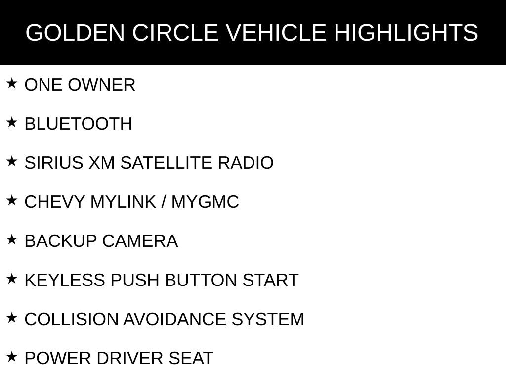 ONE OWNER, BLUETOOTH, SIRIUS XM SATELLITE RADIO, CHEVY MYLINK / MYGMC, BACKUP CAMERA, KEYLESS PUSH BUTTON START, COLLISION AVOIDANCE SYSTEM, POWER DRIVER SEAT, REMOTE START, SPRAY-IN BEDLINER, TOW PACKAGE / TRAILER PACKAGE, CUSTOM SERIES, CUSTOM CONVENIENCE PACKAGE, CUSTOM VALUE PACKAGE, PREFERRED EQUIPMENT PACKAGE 1CX, TRAILERING PACKAGE, 20" BRIGHT SILVER PAINTED ALUMINUM WHEELS, 3.42 REAR AXLE RATIO, 6-SPEAKER AUDIO SYSTEM, AIR CONDITIONING, BRAKE ASSIST, CHEVROLET CONNECTED ACCESS CAPABLE, COMPASS, DEEP-TINTED GLASS, DELAY-OFF HEADLIGHTS, DRIVER VANITY MIRROR, DUAL FRONT IMPACT AIRBAGS, DUAL FRONT SIDE IMPACT AIRBAGS, ELECTRIC REAR-WINDOW DEFOGGER, ELECTRICAL STEERING COLUMN LOCK, ELECTRONIC CRUISE CONTROL, EZ LIFT POWER LOCK & RELEASE TAILGATE, FRONT CENTER ARMREST W/STORAGE, FRONT FRAME-MOUNTED BLACK RECOVERY HOOKS, FRONT LICENSE PLATE KIT, HEATED DOOR MIRRORS, HITCH GUIDANCE, LOW TIRE PRESSURE WARNING, MANUAL TILT WHEEL STEERING COLUMN, OCCUPANT SENSING AIRBAG, ONSTAR & CHEVROLET CONNECTED SERVICES CAPABLE, OUTSIDE TEMPERATURE DISPLAY, OVERHEAD CONSOLE, PANIC ALARM, PASSENGER VANITY MIRROR, POWER DOOR MIRRORS, POWER WINDOWS, PREMIUM AUDIO SYSTEM: CHEVROLET INFOTAINMENT 3, REAR 60/40 FOLDING BENCH SEAT (FOLDS UP), REAR STEP BUMPER, REAR WINDOW DEFROSTER, REMOTE KEYLESS ENTRY, SPEED-SENSING STEERING, STANDARD TAILGATE, TACHOMETER, THEFT DETERRENT SYSTEM (UNAUTHORIZED ENTRY), TILT STEERING WHEEL, VARIABLY INTERMITTENT WIPERS, WI-FI HOT SPOT CAPABLE.