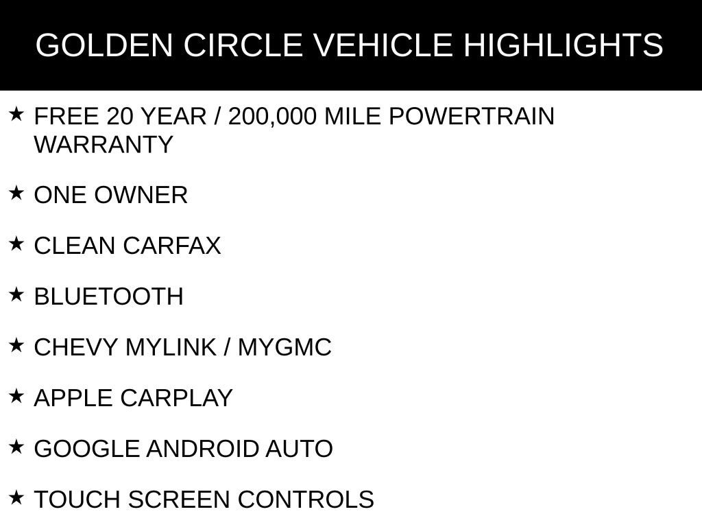 FREE 20 YEAR / 200,000 MILE POWERTRAIN WARRANTY, ONE OWNER, CLEAN CARFAX, BLUETOOTH, CUSTOM BED MAT, CHEVY MYLINK / MYGMC, APPLE CARPLAY, GOOGLE ANDROID AUTO, TOUCH SCREEN CONTROLS, BACKUP CAMERA, KEYLESS PUSH BUTTON START, COLLISION AVOIDANCE SYSTEM, COLLISION WARNING ALERT SYSTEM, REMOTE START, TOW PACKAGE / TRAILER PACKAGE, WEATHERTECH ALL WEATHER FLOOR MATS, PREFERRED EQUIPMENT PACKAGE 1WT, WT CONVENIENCE PACKAGE, WT SAFETY PACKAGE, WT VALUE PACKAGE, 17 BRIGHT SILVER PAINTED ALUMINUM WHEELS, 2-SPEAKER AUDIO SYSTEM, 3.42 REAR AXLE RATIO, AIR CONDITIONING, BLACK (SEMI-GLOSS) FRONT BUMPER, BLACK (SEMI-GLOSS) REAR BUMPER, BRAKE ASSIST, CHEVROLET CONNECTED ACCESS CAPABLE, DEEP-TINTED GLASS, DELAY-OFF HEADLIGHTS, DUAL FRONT IMPACT AIRBAGS, DUAL FRONT SIDE IMPACT AIRBAGS, ELECTRIC REAR-WINDOW DEFOGGER, ELECTRICAL STEERING COLUMN LOCK, ELECTRONIC CRUISE CONTROL, EZ LIFT POWER LOCK & RELEASE TAILGATE, FRONT FRAME-MOUNTED BLACK RECOVERY HOOKS, FULLY AUTOMATIC HEADLIGHTS, HEATED DOOR MIRRORS, HITCH GUIDANCE, INSIDE REAR-VIEW MIRROR W/TILT, LANE CHANGE ALERT W/SIDE BLIND ZONE ALERT, LANE KEEP ASSIST W/LANE DEPARTURE WARNING, LOW TIRE PRESSURE WARNING, MANUAL TILT WHEEL STEERING COLUMN, OCCUPANT SENSING AIRBAG, OVERHEAD AIRBAG, OVERHEAD CONSOLE, PASSENGER VANITY MIRROR, POWER DOOR MIRRORS, POWER WINDOWS, REAR PEDESTRIAN ALERT, REAR READING LIGHTS, REAR STEP BUMPER, REMOTE KEYLESS ENTRY, SPEED-SENSING STEERING, VARIABLY INTERMITTENT WIPERS.