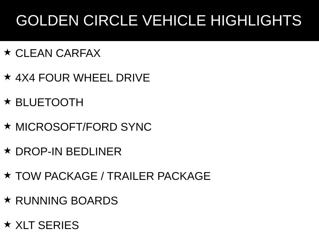 CLEAN CARFAX, 4X4 FOUR WHEEL DRIVE, BLUETOOTH, MICROSOFT/FORD SYNC, DROP-IN BEDLINER, TOW PACKAGE / TRAILER PACKAGE, RUNNING BOARDS, XLT SERIES, PREFERRED EQUIPMENT PACKAGE 507A, TRAILER TOW PACKAGE, XLT CHROME PACKAGE, XLT CONVENIENCE PACKAGE, XLT PLUS PACKAGE, 18 CHROME-CLAD ALUMINUM WHEELS, 3.55 AXLE RATIO, 4 SPEAKERS, AIR CONDITIONING, AUXILIARY TRANSMISSION OIL COOLER, COMPASS, DELAY-OFF HEADLIGHTS, DUAL FRONT IMPACT AIRBAGS, DUAL FRONT SIDE IMPACT AIRBAGS, ELECTRONIC STABILITY CONTROL, FRONT CENTER ARMREST W/STORAGE, FRONT FOG LIGHTS, HEATED POWER SIDE MIRRORS, ILLUMINATED ENTRY, LOW TIRE PRESSURE WARNING, OCCUPANT SENSING AIRBAG, OUTSIDE TEMPERATURE DISPLAY, OVERHEAD CONSOLE, PANIC ALARM, PASSENGER VANITY MIRROR, POWER DOOR MIRRORS, POWER SLIDING REAR WINDOW W/DEFROST & PRIVACY TINT, POWER WINDOWS, REMOTE KEYLESS ENTRY, SELECTSHIFT TRANSMISSION, SELF-DIMMING REAR-VIEW MIRROR, SPEED-SENSING STEERING, SPLIT FOLDING REAR SEAT, TILT STEERING WHEEL, TRACTION CONTROL, VARIABLY INTERMITTENT WIPERS.