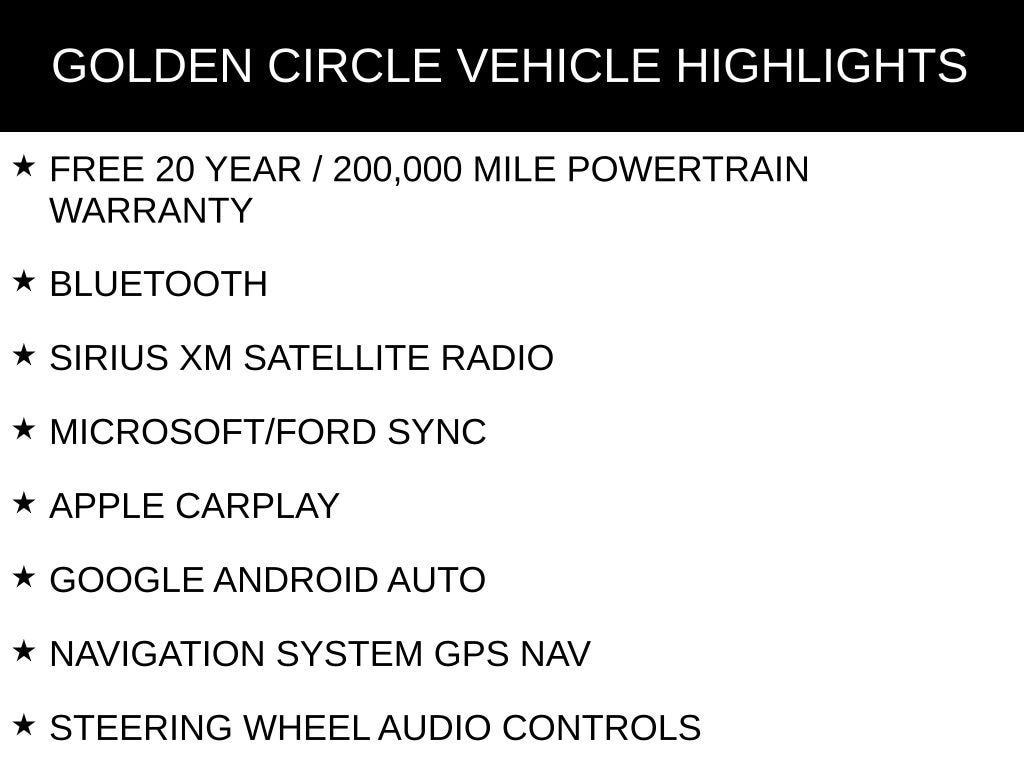 FREE 20 YEAR / 200,000 MILE POWERTRAIN WARRANTY, BLUETOOTH, SIRIUS XM SATELLITE RADIO, MICROSOFT/FORD SYNC, APPLE CARPLAY, GOOGLE ANDROID AUTO, NAVIGATION SYSTEM GPS NAV, STEERING WHEEL AUDIO CONTROLS, TOUCH SCREEN CONTROLS, BACKUP CAMERA, KEYLESS PUSH BUTTON START, HEATED FRONT CLOTH SEATS, SUNROOF/MOONROOF, SE SERIES, EQUIPMENT PACKAGE 200A, SE CONVENIENCE PACKAGE, 16" SHADOW SILVER PAINTED ALUMINUM WHEELS, 7 SPEAKERS, AIR CONDITIONING, AUTOMATIC TEMPERATURE CONTROL, BLIS BLIND SPOT INFORMATION SYSTEM, BRAKE ASSIST, COMPASS, DELAY-OFF HEADLIGHTS, DRIVER VANITY MIRROR, ELECTRONIC STABILITY CONTROL, EMERGENCY COMMUNICATION SYSTEM: SYNC 3 911 ASSIST, FRONT CENTER ARMREST, FRONT FOG LIGHTS, LOW TIRE PRESSURE WARNING, OCCUPANT SENSING AIRBAG, OUTSIDE TEMPERATURE DISPLAY, OVERHEAD CONSOLE, PANIC ALARM, PASSENGER VANITY MIRROR, POWER WINDOWS, REAR WINDOW DEFROSTER, REAR WINDOW WIPER, REMOTE KEYLESS ENTRY, ROOF RACK: RAILS ONLY, SPEED CONTROL, SPEED-SENSING STEERING, SPLIT FOLDING REAR SEAT, TELESCOPING STEERING WHEEL, TILT STEERING WHEEL, TURN SIGNAL INDICATOR MIRRORS, VARIABLY INTERMITTENT WIPERS.