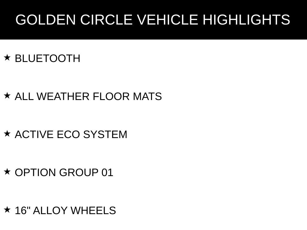 BLUETOOTH, ALL WEATHER FLOOR MATS, ACTIVE ECO SYSTEM, OPTION GROUP 01, 16" ALLOY WHEELS, 6 SPEAKERS, AIR CONDITIONING, CD PLAYER, DELAY-OFF HEADLIGHTS, DRIVER VANITY MIRROR, DUAL FRONT IMPACT AIRBAGS, DUAL FRONT SIDE IMPACT AIRBAGS, FRONT FOG LIGHTS, OCCUPANT SENSING AIRBAG, OUTSIDE TEMPERATURE DISPLAY, OVERHEAD AIRBAG, OVERHEAD CONSOLE, PANIC ALARM, PASSENGER VANITY MIRROR, POWER WINDOWS, REAR WINDOW DEFROSTER, REMOTE KEYLESS ENTRY, SLIDING CENTER ARMREST, TELESCOPING STEERING WHEEL, VARIABLY INTERMITTENT WIPERS.